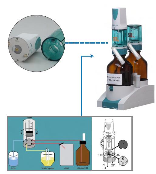 | 攪拌器,滴定臺 | 內置 802 螺旋攪拌 另外還可添加 1 x 801 磁力攪拌 或 1 x 802 螺旋攪拌 或 1 x 803 吸排液滴定臺 | 帶有數據芯片的智能交換單元/多思TM Dosino加液單元 | 至多 2 x 多思TM Dosino加液單元或 2 x 805 Dosimat 加液器 |