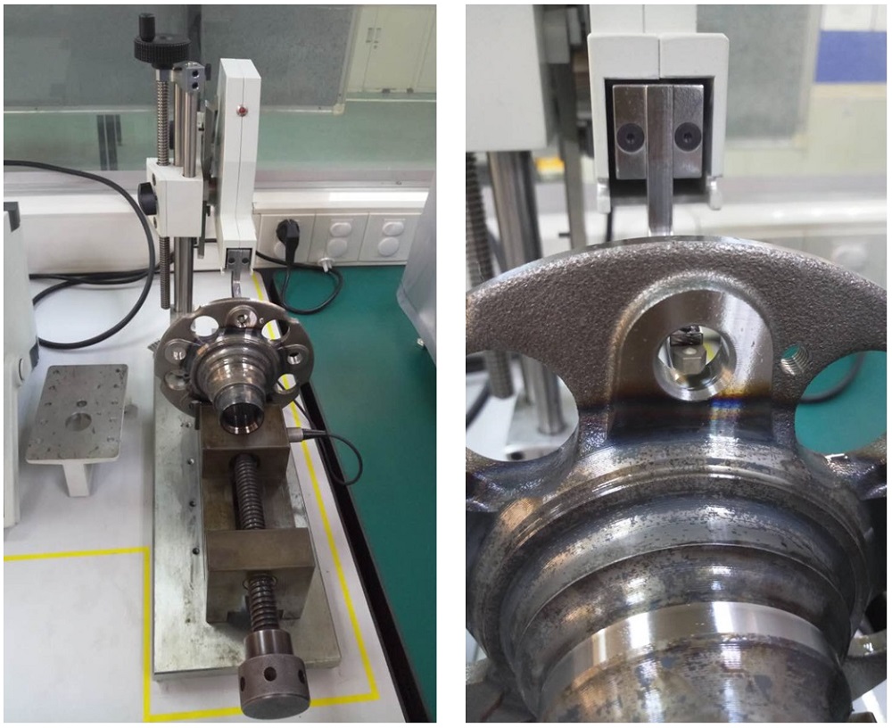 汽車上的軸承多種多樣,對(duì)各個(gè)部件的要求的也都十分嚴(yán)格。因?yàn)槟骋粋€(gè)部件一點(diǎn)小的性能差別都可能造成可靠隱患。 汽車軸承上的一些固定的用的螺栓孔也是非常重要的,不僅要求孔的尺寸和定位精度,同時(shí)對(duì)加工時(shí)的質(zhì)量也有很高的要求。要求孔在加工的過程中不能產(chǎn)生加工硬化,以免對(duì)整個(gè)零件的長期穩(wěn)定性產(chǎn)生影響。那么檢查是否有加工硬化產(chǎn)生又能不破壞零件,好的辦法就是采用小載荷的維氏硬度檢測(cè)。但是由于孔洞的尺寸一般只有十幾個(gè)毫米,想要進(jìn)行維氏硬度測(cè)試是很難實(shí)現(xiàn)的。 恩斯特的MTR硬度計(jì)就能很好的解決孔洞內(nèi)側(cè)硬度測(cè)試的難題。