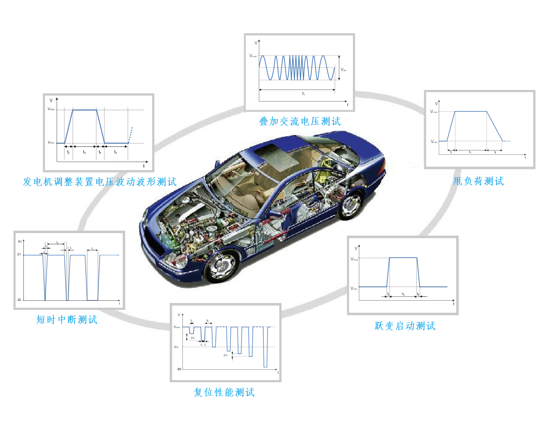 本測試系統可為各汽車公司制定的電性能測試標準要求提供靈活的解決方案,應用于檢測汽車零部件的功能檢驗和可靠性能檢驗,可滿足GMW 3172、VW 80000、LV 124等汽車企業標準的測試要求。