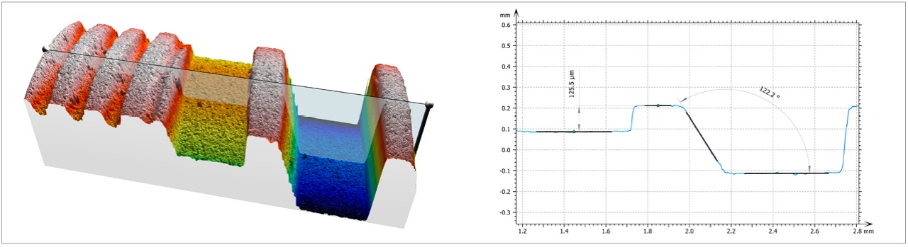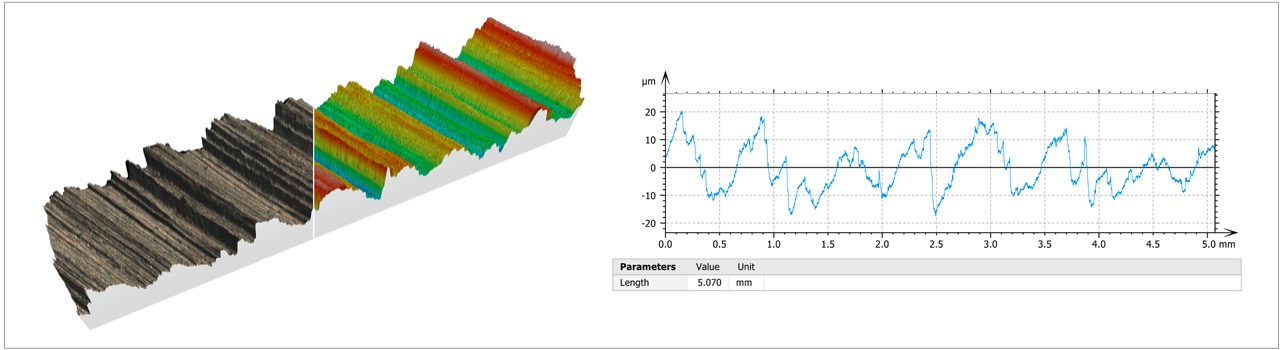 機(jī)械加工金屬表面:(左圖)由 20x/0.7 物鏡拍攝的四張真彩表面紋理疊加 3D 彩色編碼高度圖的拼接圖片;(右圖)以垂直于機(jī)械加工方向獲取的粗糙度剖面圖,顯示了表面輪廓。